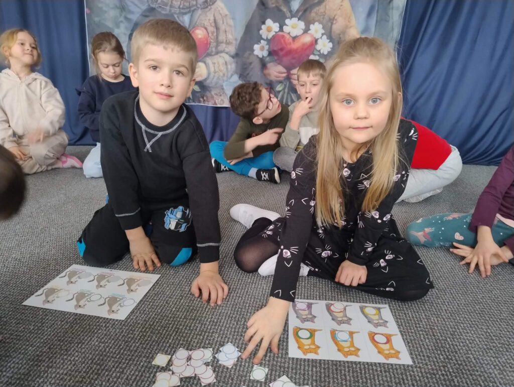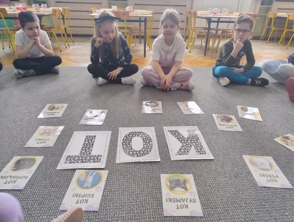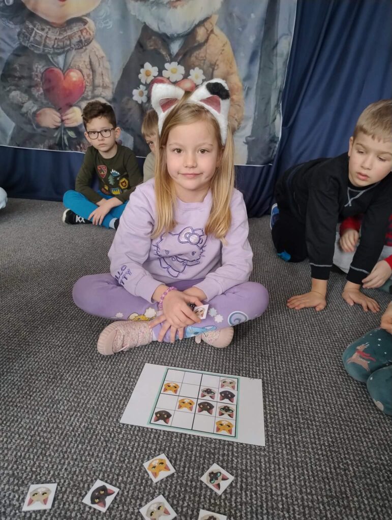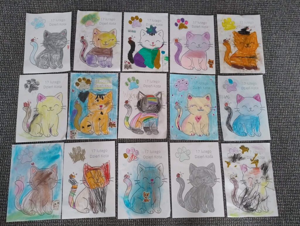 17 lutego świętowaliśmy Dzień Kota! Tego dnia dzieci zamieniły się w małe kotki – nie zabrakło przebrań, opasek z uszkami i wesołego mruczenia.Wspólnie uczestniczyliśmy w wielu „kocich” zabawach i wykonaliśmy przepiekne Kotki 🐱