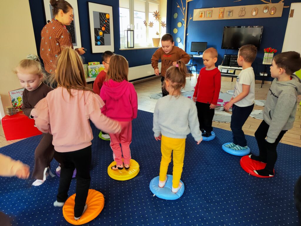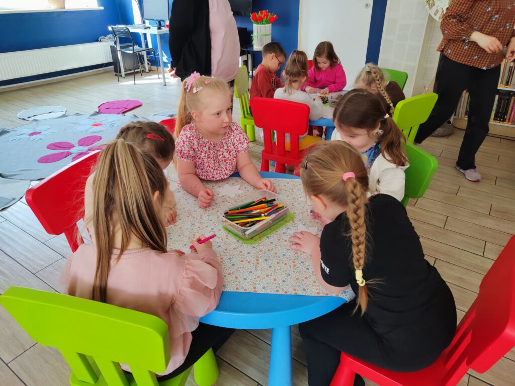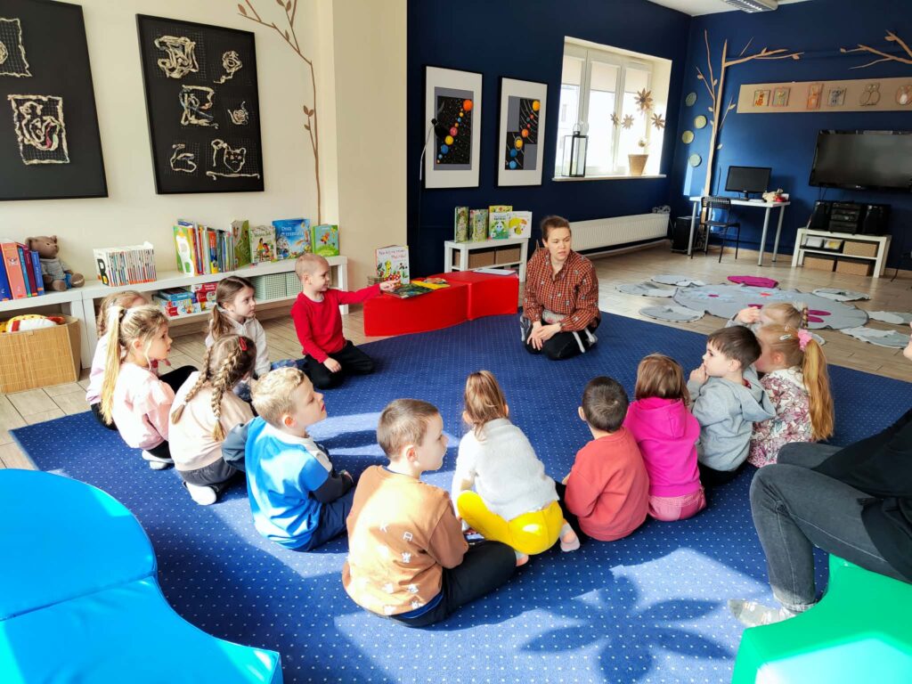 Grupa Żyrafki wybrała się do Miejskiej Biblioteki Publicznej przy ul. 3 Maja, gdzie odbyły się zajęcia biblioteczne. Tematem przewodnim była Wiosna. Przedszkolaki opowiadały o zaobserwowanych zwiastunach Wiosny, rozwiązywały zagadki oraz słuchały opowiadania o małej popielicy, która nie chciała obudzić się z zimowego snu. Na koniec dzieci usiadły przy stolikach i każde z nich mogło udekorować swój wiosenny kwiatek.