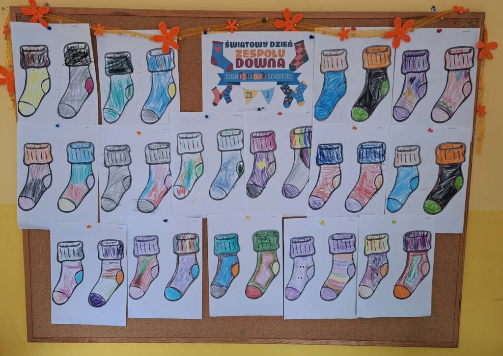 20 marca Tygryski 🐯 obchodziły wyjątkowe święto – Dzień Kolorowej Skarpetki 🧦. Z tej okazji Przedszkolaki dowiedziały się czym jest Zespół Downa 🤔. Była to także doskonała okazja do rozmów o tolerancji i wzajemnej akceptacji 👫. Jako wyraz wsparcia i solidarności 🤝 dzieci założyły tego dnia dwie różnokolorowe skarpetki oraz wykonały tematyczne prace plastyczne ✍️🎨